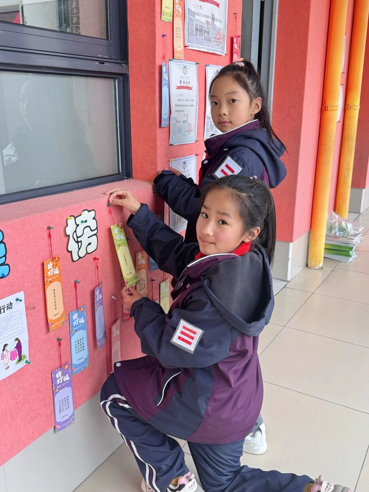 用红彤彤的灯笼装点教室与校园